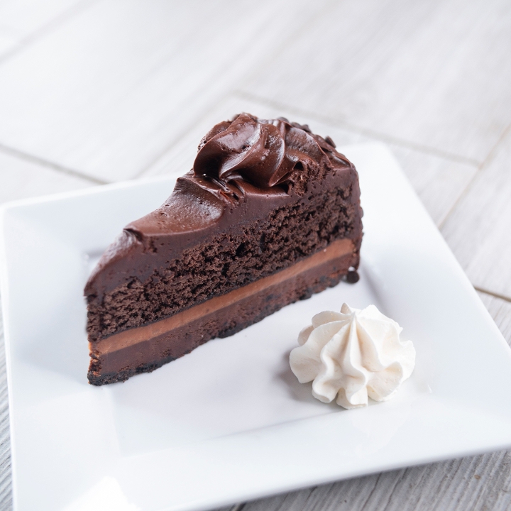 Chocolate ganache icing atop rich chocolate cake, chocolate mousse, and a chocolate cookie crust.
