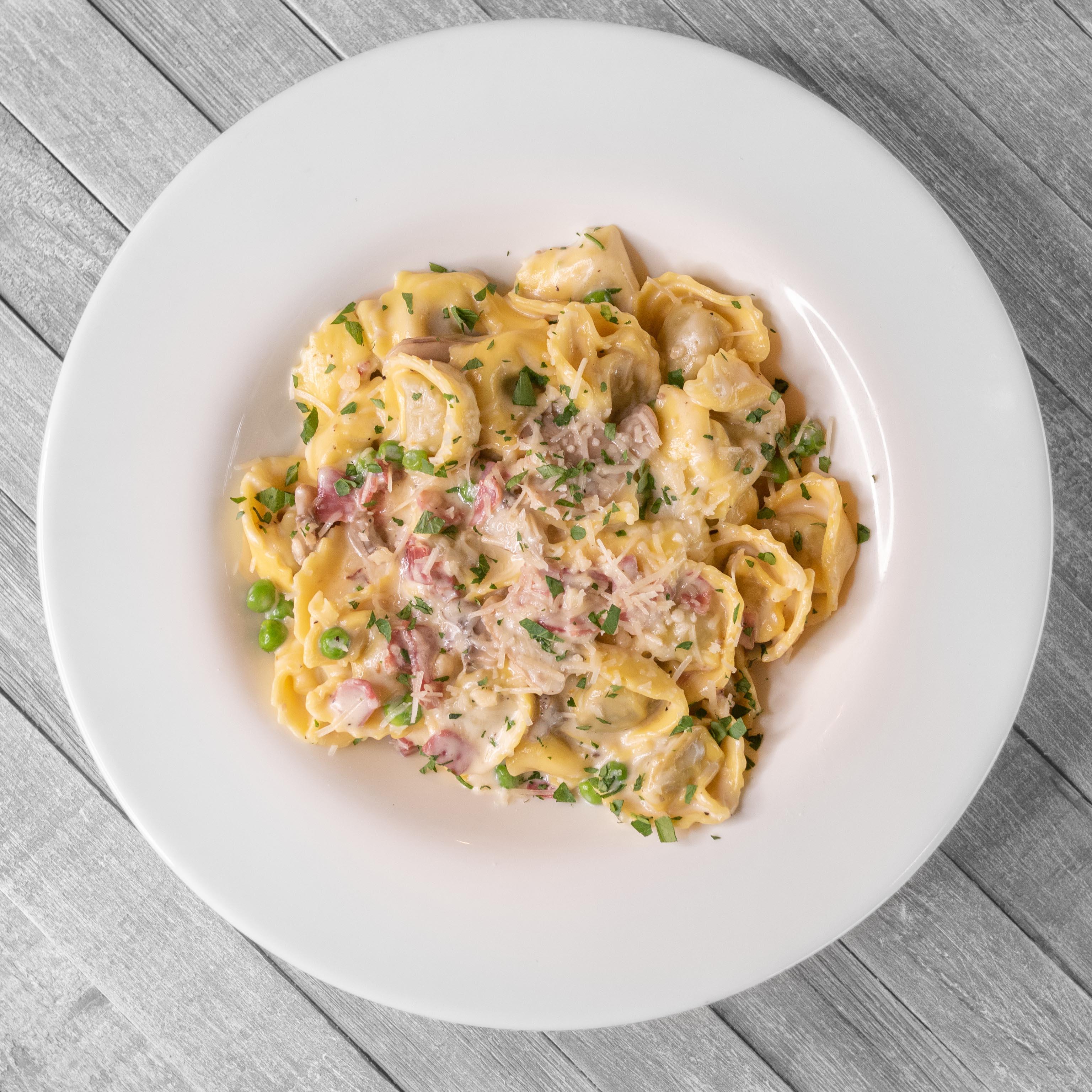 Ring-shaped pasta stuffed with beef and pork. Tossed with peas, mushrooms, and prosciutto in our savory cream sauce.