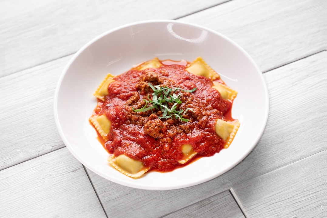 Beef-filled Ravioli pasta served with our small-batch tomato sauce. Add meat sauce, meatballs, or Italian sausage.