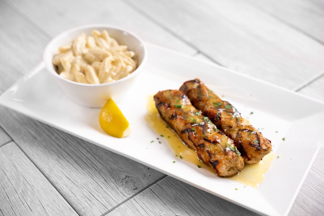 Marinated chicken breast, breaded, skewered and sauteed until crispy. Includes a choice of side and a salad.