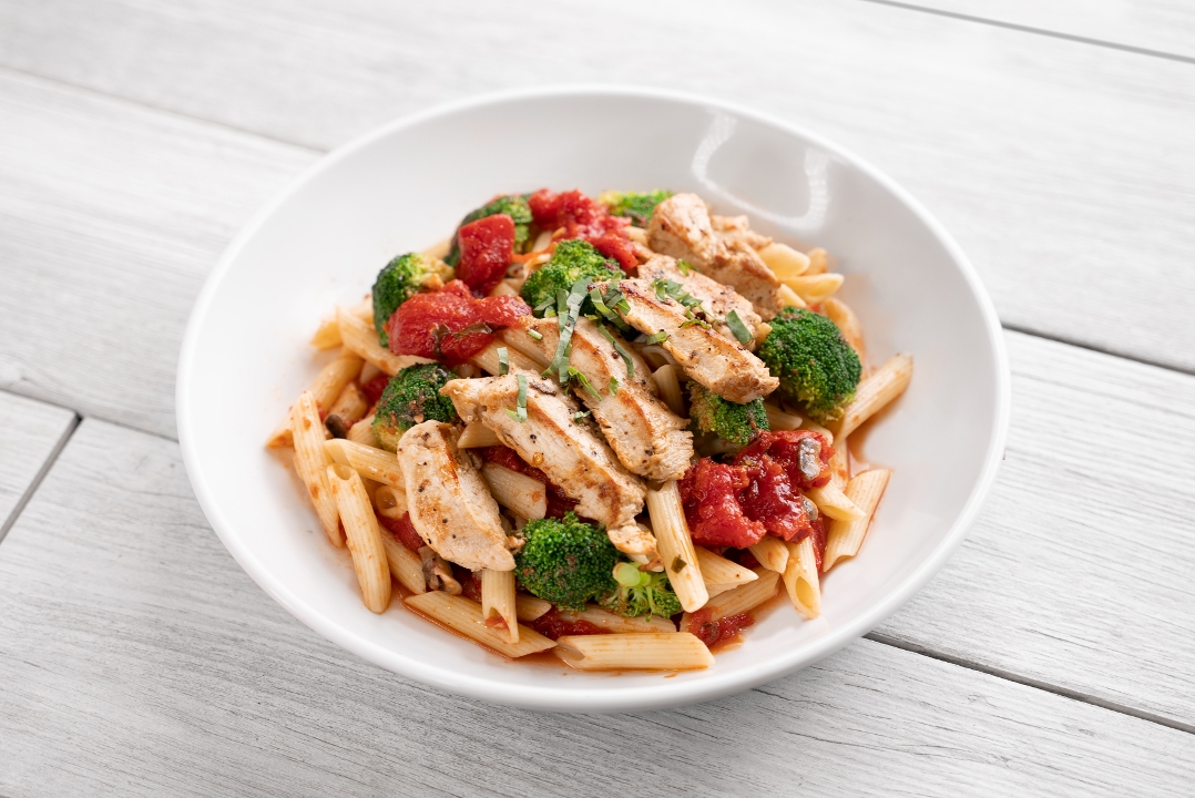 Penne pasta tossed with mushrooms, broccoli, roasted tomatoes, olive oil, garlic, and Pomodoro sauce. Vegetarian Friendly.