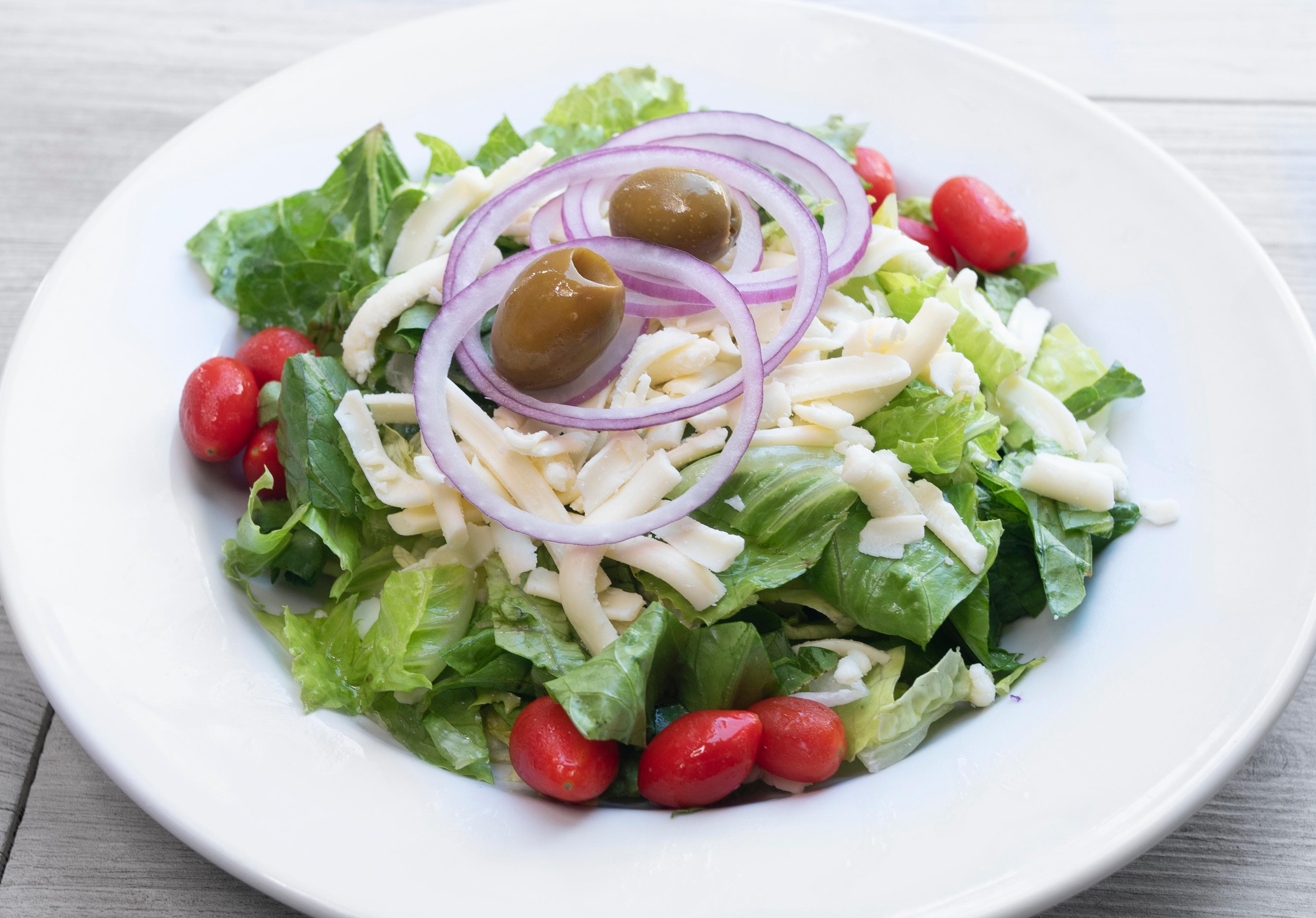 Lettuce, cherry tomatoes, onions, olives, & Provel cheese.