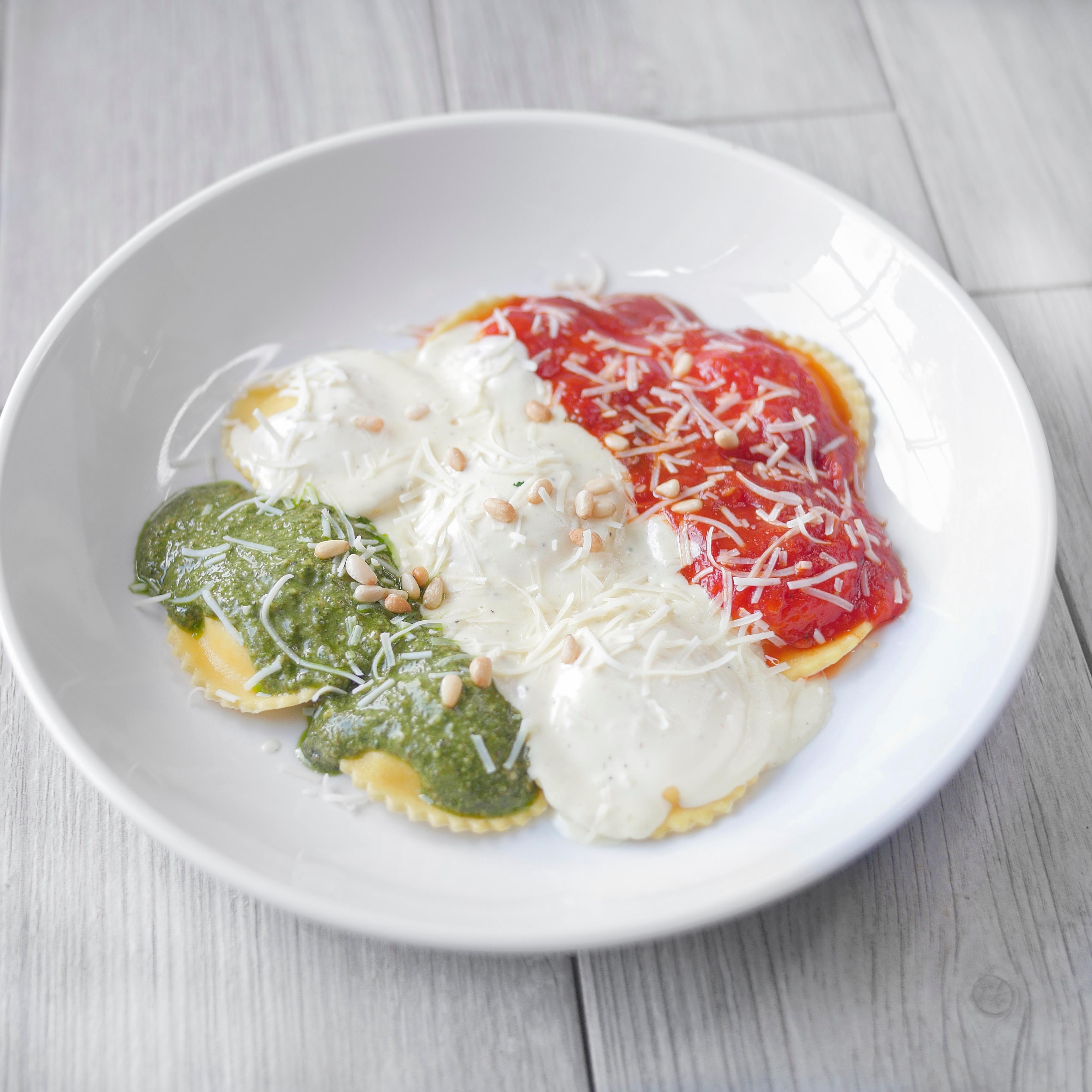 Jumbo ravioli stuffed with salted ricotta and topped with three sauces: tomato, cream, and pesto.