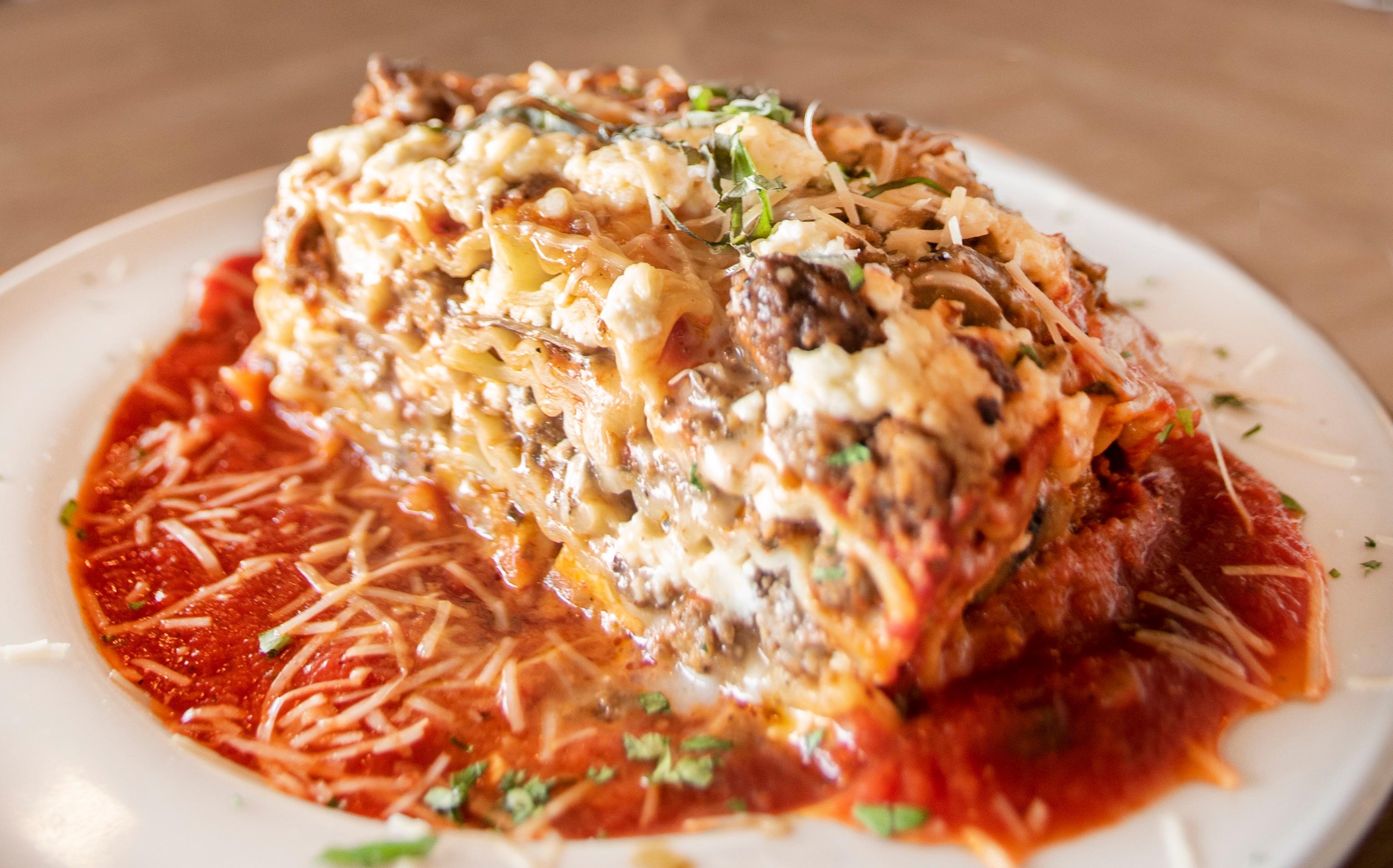 Wide flat pasta, layered with rich meat sauce, sauteed mushrooms, ricotta, Provel, and Mozzarella cheeses. (Unfortunately cannot be ordered without mushrooms)