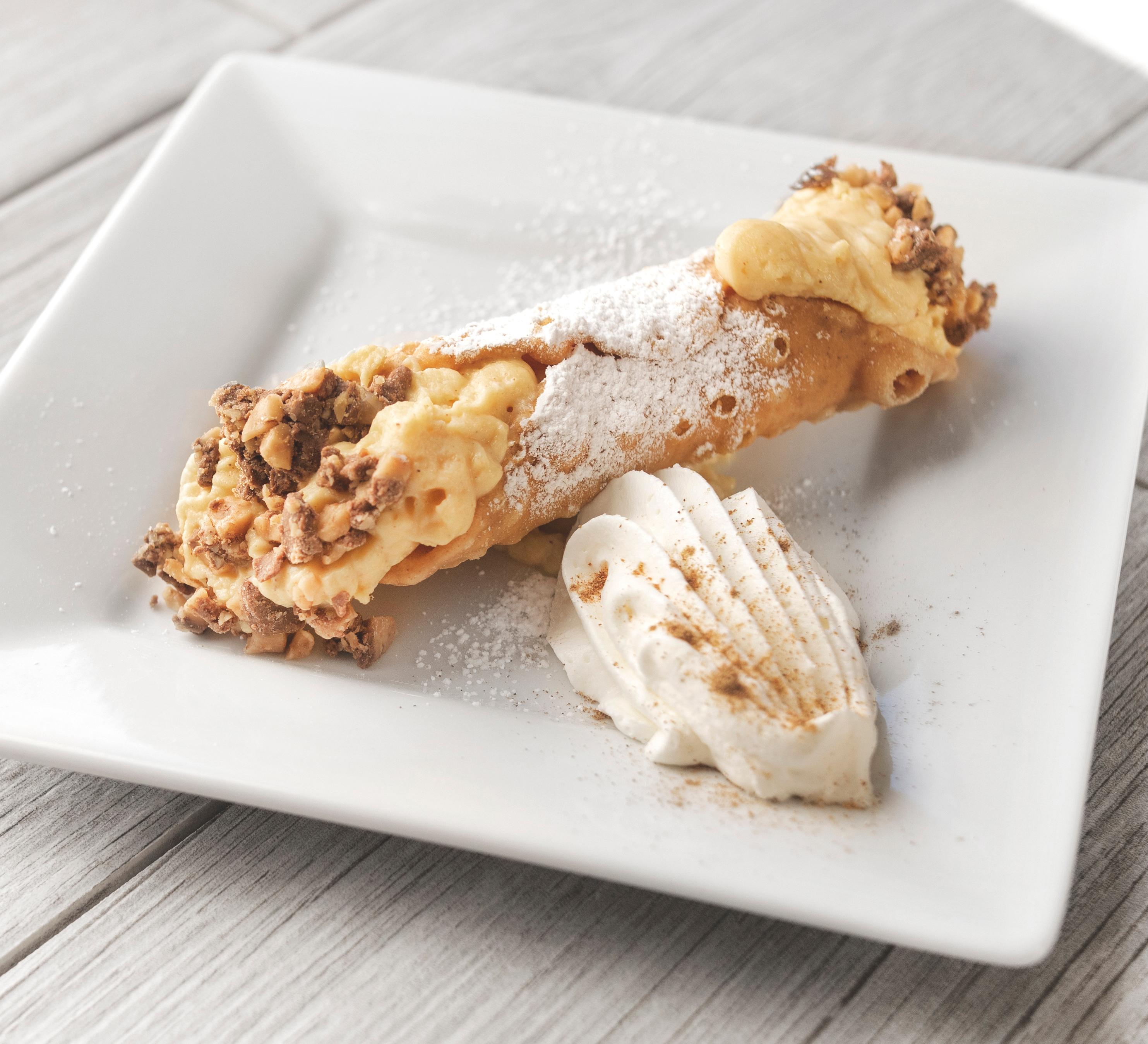 Sweet ricotta, pumpkin puree, pumpkin spice, dipped in toffee and chocolate candy crumble in a crisp pastry shell.