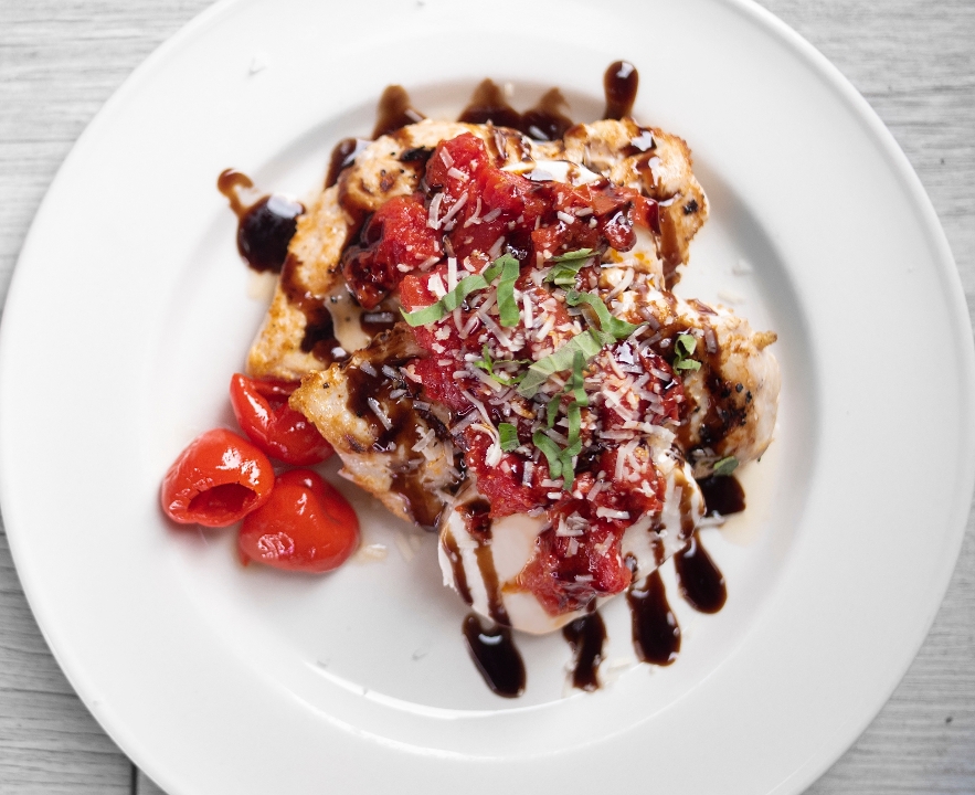 Two marinated chicken breast, grilled & topped with fresh mozzarella, garlic Pomodoro, sweet Pepperdeau peppers, & drizzled with a balsamic vinegar reduction. Served with salad.