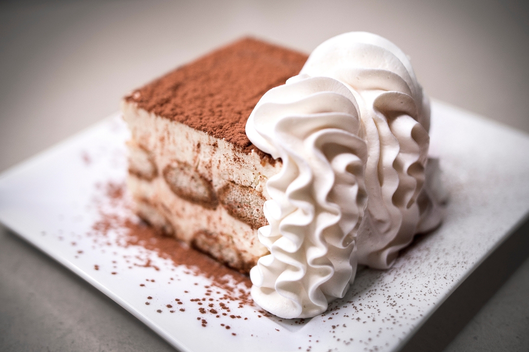Sharable slice of an Italian classic. Mascarpone vanilla custard layered with espresso dipped Italian sponge cake. Topped with cocoa and whipped cream. (contains alcohol)